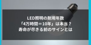 中小企業 / 省エネ / 節電 / 電気設備 LED照明の耐用年数「4万時間=10年」は本当?寿命が尽きる前のサインとは LED照明の耐用年数「4万時間=10年」は、JIS規格で定められた「光束維持率70%」に基づく理論値で、実際は明るさが新品時の70%に低下するまでの時間を示します。使用環境や点灯時間により寿命は大きく異なり、高温多湿やホコリ、電圧変動は劣化を早めます。明るさの低下、ちらつき、色味の変化、異音・異臭などは寿命が近いサイン。定期的な清掃や適切な設置環境で寿命を延ばし、安全で快適な照明を維持しましょう。